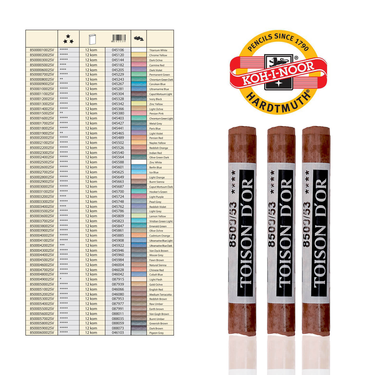 Umetničke pastele prečnika 10 mm i dužine 75 mm Imaju najširu paletu nijansi boja i posebna svojstva pisanja kao i otpornost na svetlost. KOH-I-NOOR držač za pastele je idealan za upotrebu i crtanje pastelama. Potrebno je da se na kraju crtež stabilizuje fiksativom.