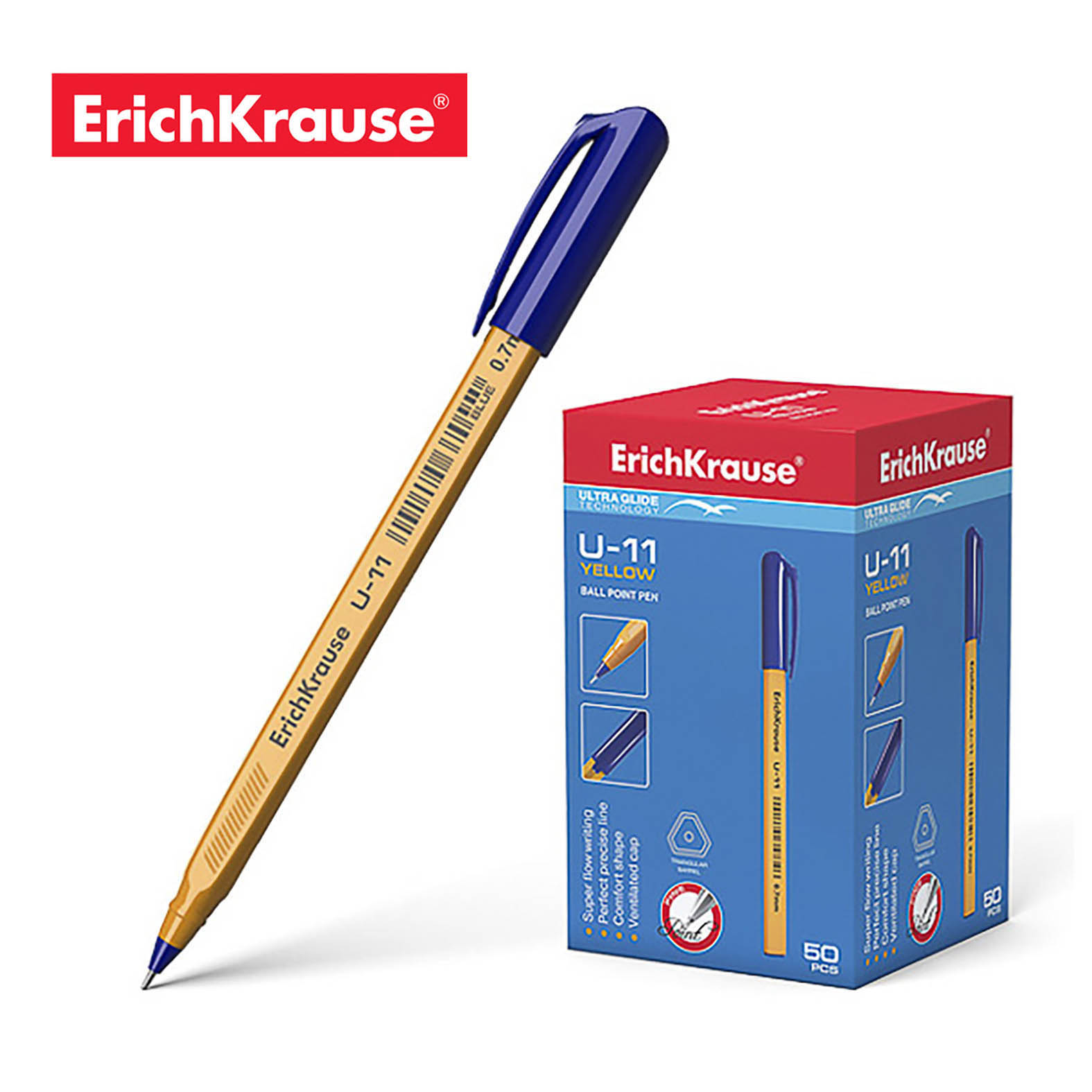 Trouglasta hemijska olovka za jednokratnu upotrebu sa tankim vrhom i jedinstvenom tehnologijom Ultra Glide. Olovka ima neprozirno naradžčasto telo sa udobnim prostorom za držanje . Boja poklopca odgovara boji mastila. Vrh je prečnika kuglice od 0.7 mm u kombinaciji sa mastilom male viskoznosti omoguc´ava lako. meko i brzo pisanje. Dužina kontinuirane linije je 1000 m u širini od 0.35 mm.