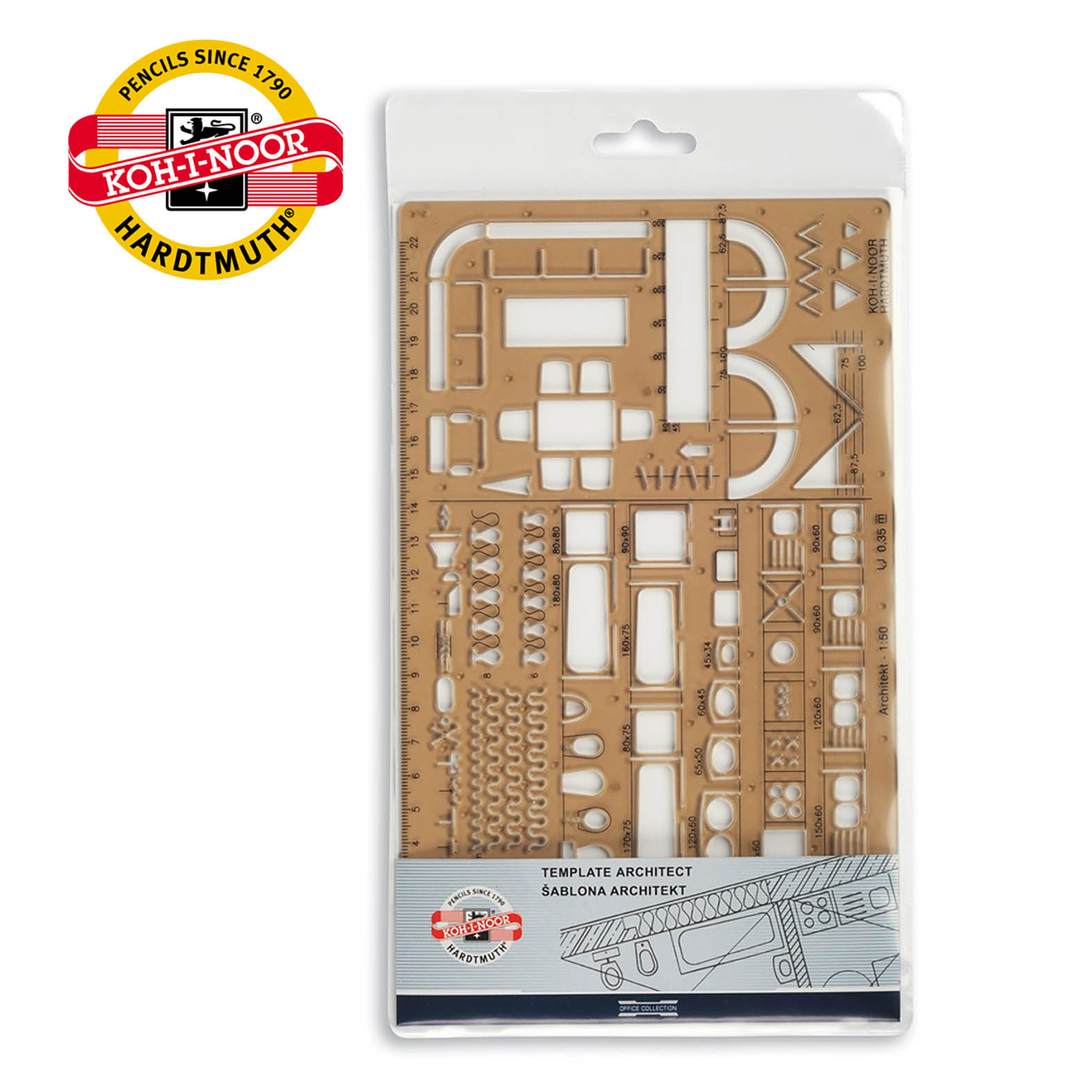 Arhitektonski šablon je napravljen za crtanje dijagrama arhitektonskih dizajna enterijera u razmeri 1:50. Pogodan je za rad sa šiljastom olovkom. mikroolovkom ili tehničkom olovkom od 0.35 mm. Na gornjoj ivici matrice odštampana je milimetarska skala sa svakom cifrom. Šablon je namenjen za upotrebu u školi i u kancelariji