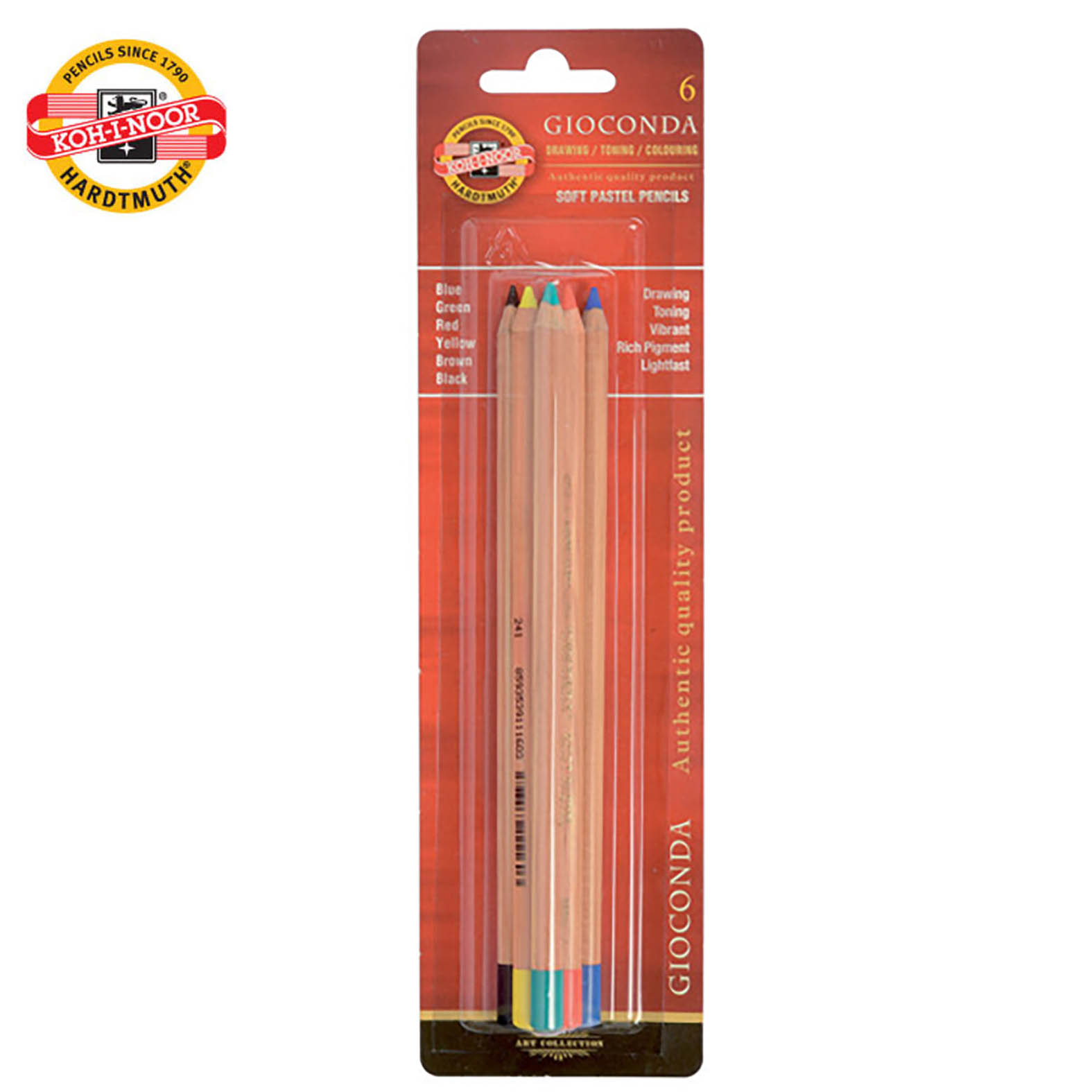 Set od 6 boja drvenih olovaka koje su zapravo krede u metalnom pakovanju. Širina jezgra je 4.2 mm. a sama drvena olovka je od kvalitetne kedrovine. Posebno je pogodna za tanke linije i naglašavanje kontura. Može se razmazati raspršivačem ili čak prstom. Gotov crtež mora biti stabilizovan fiksatorom.