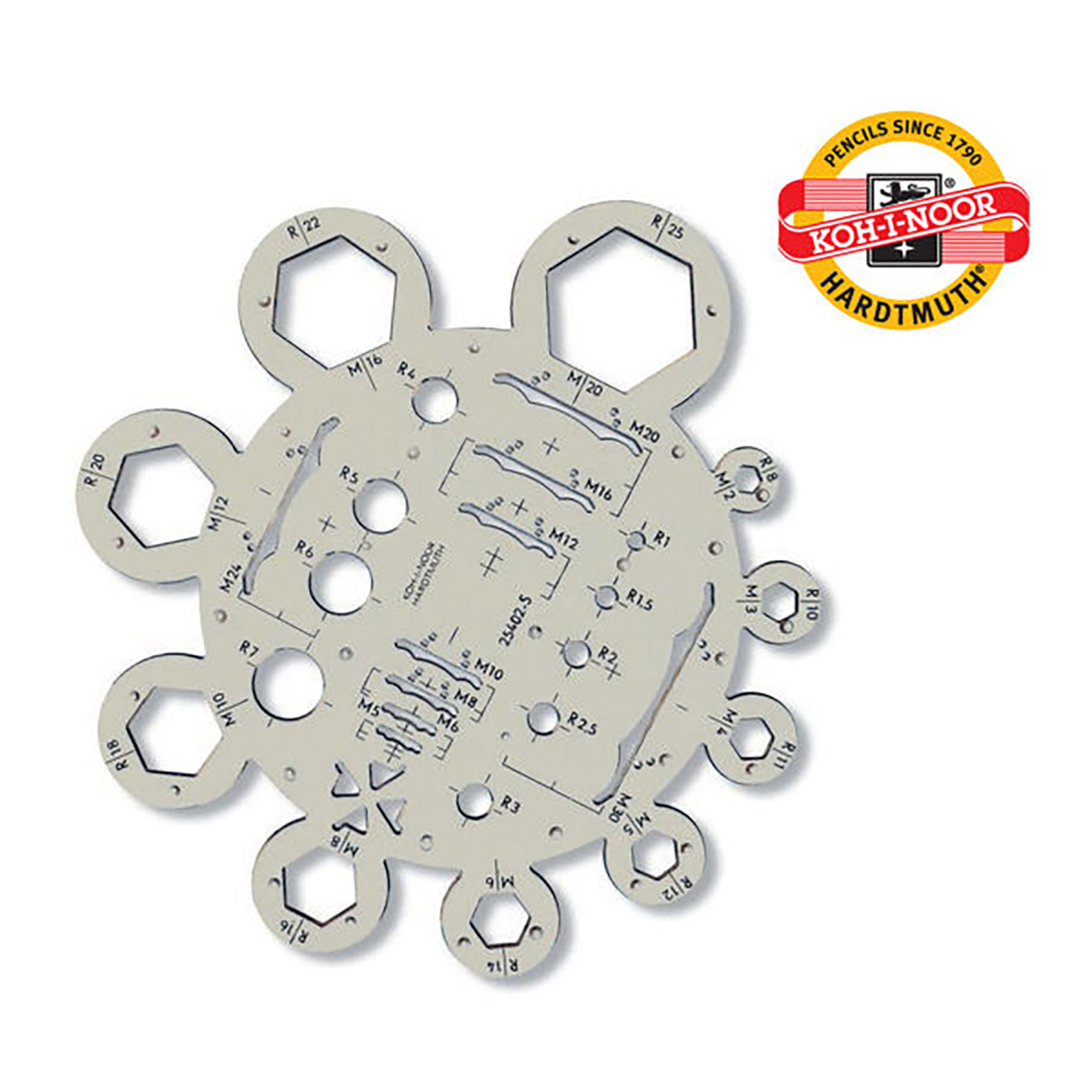 Šablon je napravljen za izvlačenje dijametara. matica i šrafova. Proizvod je predviđen za rad sa naoštrenom olovkom. mikroolovkom ili tehničkom olovkom. Sadrži R-1; 1.5; 2; 2.5; 3; 4; 5; 6; 7; 8; 10; 11; 12; 14; 16; 18; 20; 22; 25 mm i matica M 2; 3; 4; 5; 6; 8; 10; 12; 16; 20; 24; 30. Sve rupe i krivine označene su odgovarajuc´im podacima za lakšu identifikaciju u upotrebu. Šablon je namenjen crtanju i tehničkom crtanju u školi i u kancelariji.